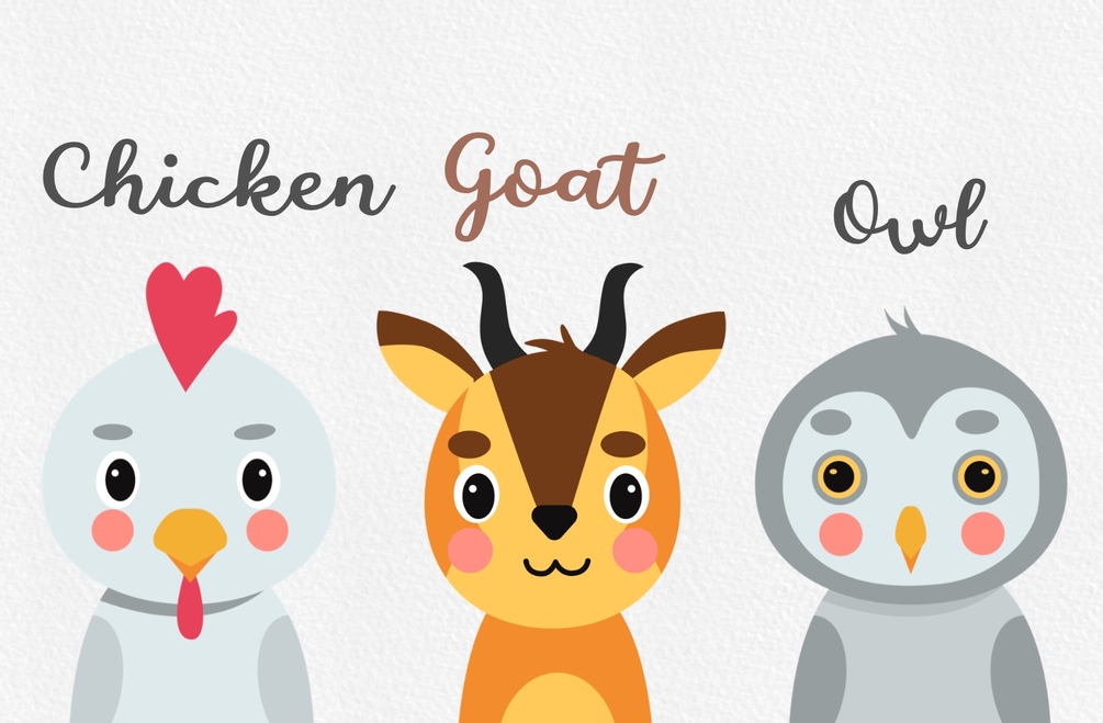 1. Cow 2. Frog 3. Pig 4. Owl 5. Chicken