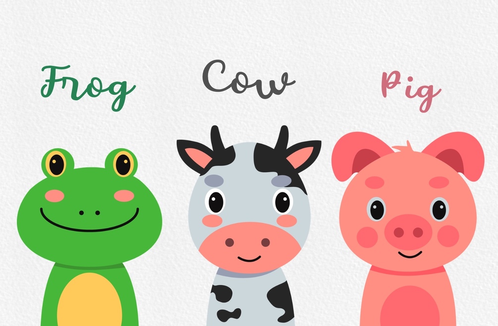 1. Cow 2. Frog 3. Pig 4. Owl 5. Chicken
